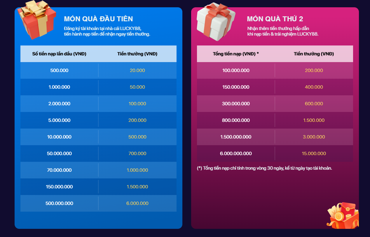 Lucky88 luôn chào đón thành viên mới với những ưu đãi hấp dẫn không thể bỏ qua. Ngay khi đăng ký và hoàn tất quá trình xác minh tài khoản, người chơi sẽ nhận được gói thưởng chào mừng với giá trị lên đến 100% số tiền nạp đầu tiên.