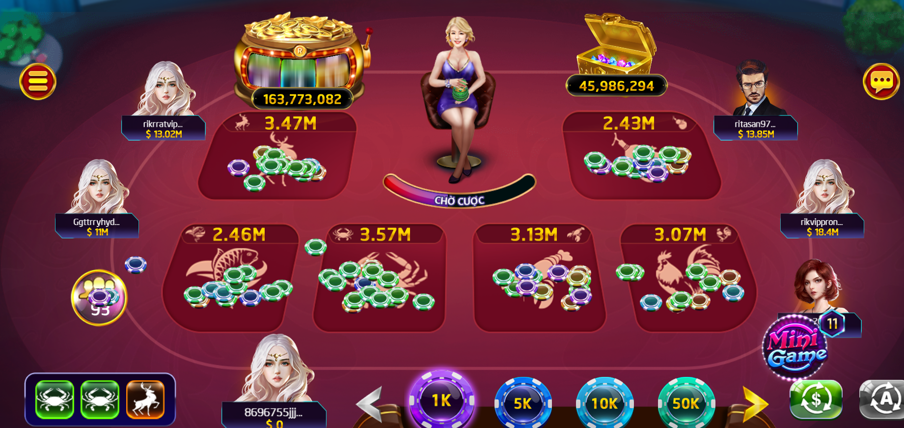 Bầu Cua là một trò chơi dân gian quen thuộc với người Việt, đặc biệt phổ biến vào dịp Tết Nguyên Đán. Tại Lucky88, Bầu Cua được thiết kế với đồ họa sắc nét, âm thanh sống động, tạo cảm giác như đang chơi trực tiếp tại sòng bạc. Người chơi có thể đặt cược vào các biểu tượng như Bầu, Cua, Cá, Gà, Nai, Tôm và nhận thưởng nếu kết quả xuất hiện đúng biểu tượng đã đặt.