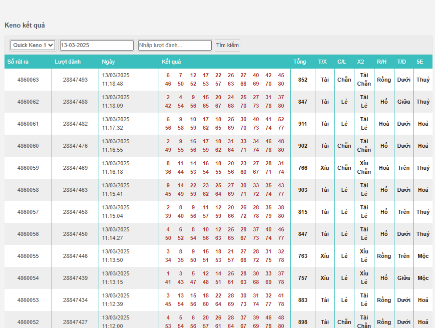Ví dụ: 20 quả bóng được rút ra là: 10, 5, 2, 14, 13, 16, 20, 21, 35, 50, 52, 39, 29, 70, 61, 11, 71, 8, 33, 73. Tổng 20 số này là 633. Chọn Lẻ sẽ thắng.