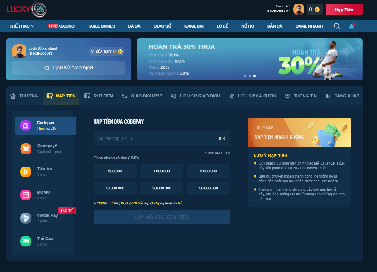 Để nạp tiền qua Codepay, trước tiên bạn cần đăng nhập vào tài khoản Lucky88 của mình. Sau đó, truy cập vào mục “Nạp tiền” hoặc “Gửi tiền” trong phần “Quản lý tài khoản”. Tại đây, bạn sẽ thấy phương thức thanh toán “Codepay” trong danh sách các phương thức nạp tiền.