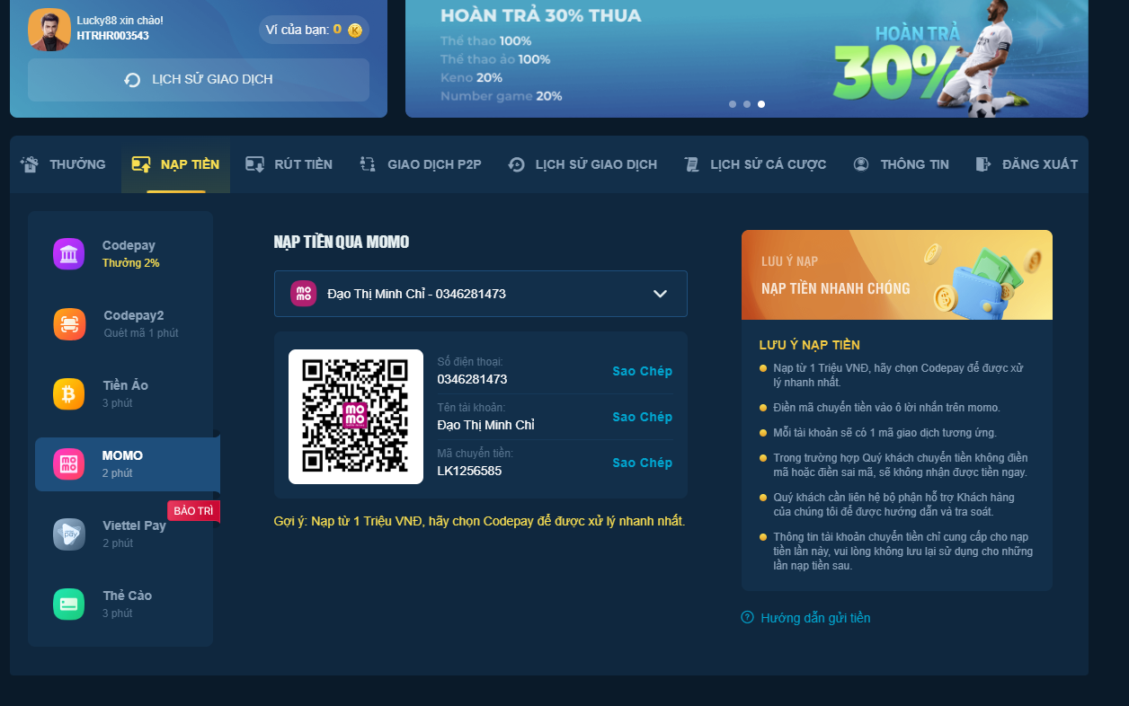 Sau khi đăng nhập Lucky88, bạn vào mục “Nạp tiền” và chọn phương thức thanh toán “MOMO”. Tiếp theo, bạn cần nhập số tiền muốn nạp.. Hệ thống sẽ hiển thị thông tin tài khoản MOMO cần chuyển khoản, bao gồm số điện thoại nhận tiền, tên chủ tài khoản, số tiền cần chuyển và nội dung chuyển khoản.