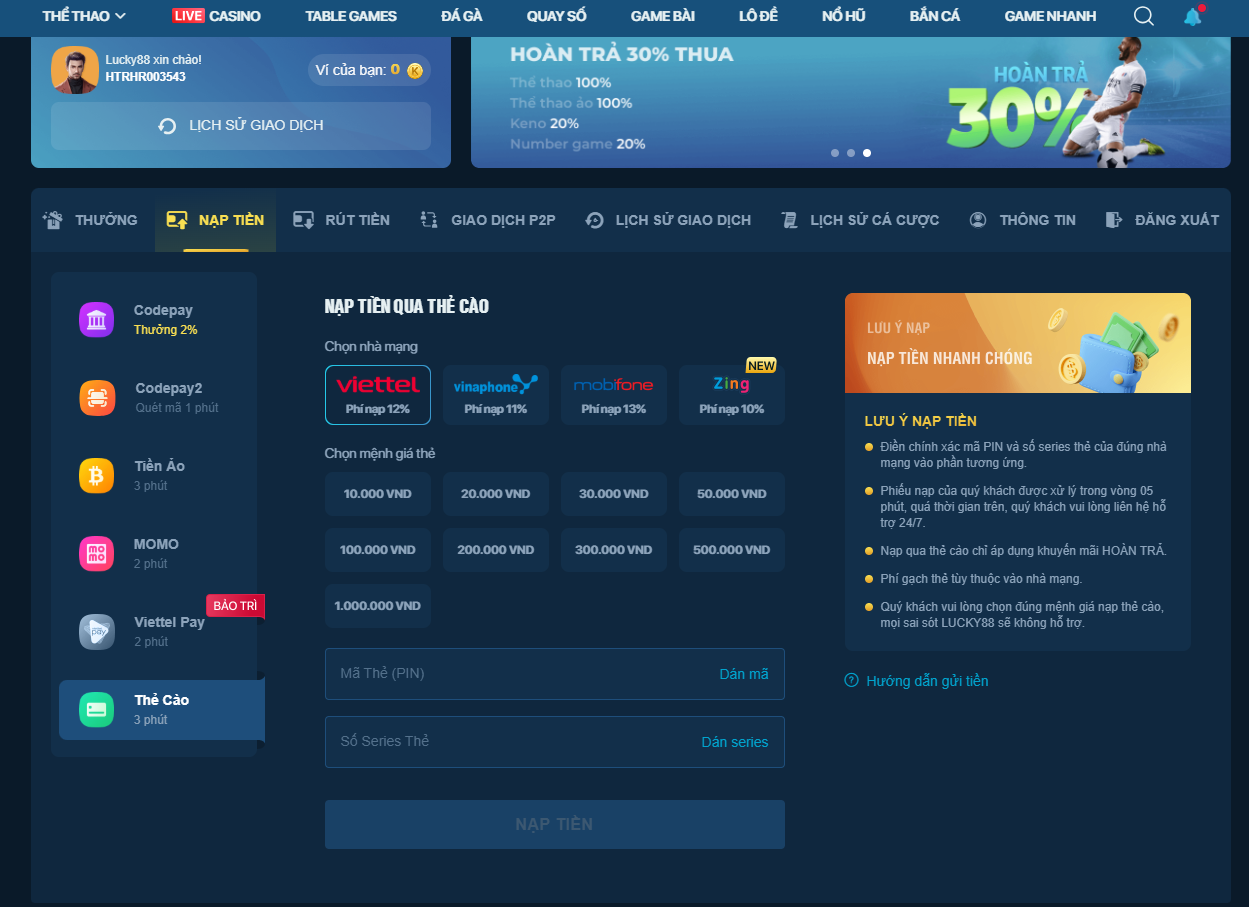 Lucky88 hỗ trợ các loại thẻ cào phổ biến như Viettel, Mobifone, Vinaphone và Vietnamobile. Để nạp tiền bằng thẻ cào, bạn cần đăng nhập vào tài khoản Lucky88, vào mục “Nạp tiền” và chọn phương thức “Thẻ cào” hoặc “Thẻ nạp điện thoại”. Sau đó, chọn loại thẻ cào bạn có và mệnh giá thẻ (thường từ 50.000 đến 500.000 VNĐ).