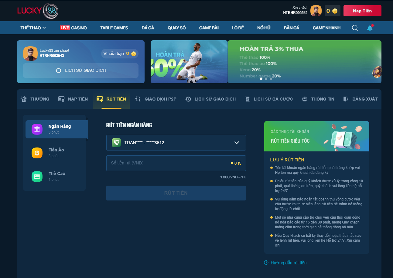 Việc rút tiền tại Lucky88 cũng được thiết kế để đơn giản và thuận tiện cho người dùng.
