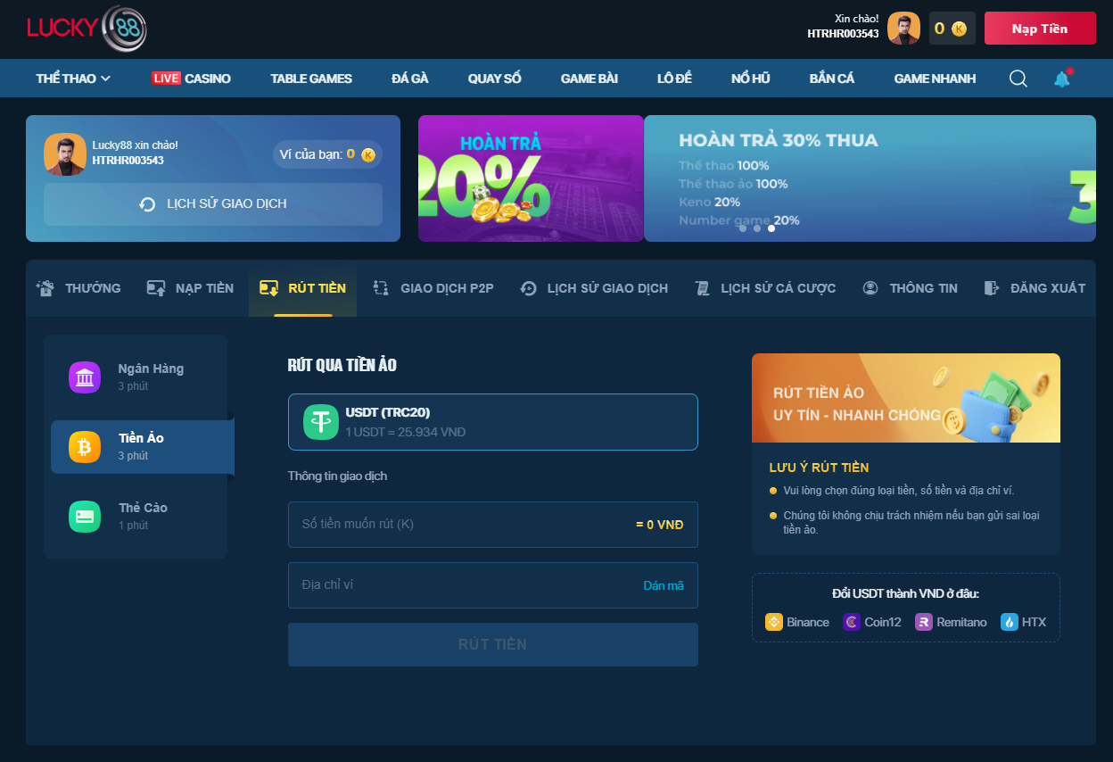 Lucky88 hỗ trợ rút tiền qua nhiều loại tiền ảo phổ biến như Bitcoin (BTC), Ethereum (ETH), Tether (USDT), Bitcoin Cash (BCH), Litecoin (LTC) và Ripple (XRP).